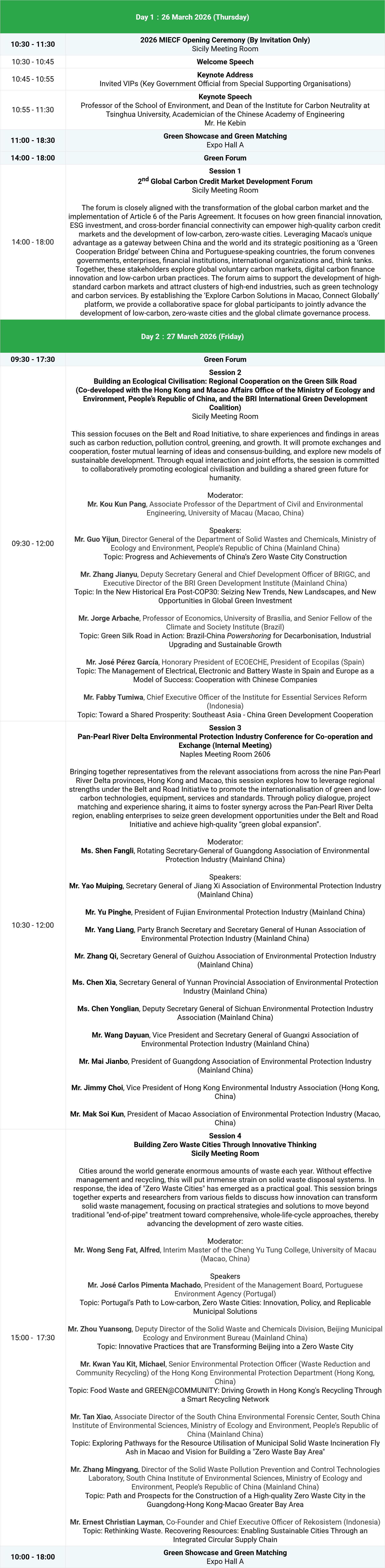 | 14:00 - 18:00 | Session 1 2nd Global Carbon Credit Market Development Forum Sicily Meeting Room The forum is closely aligned with the transformation of the global carbon market and the implementation of Article 6 of the Paris Agreement. It focuses on how green financial innovation, ESG investment, and cross-border financial connectivity can empower high-quality carbon credit markets and the development of low-carbon, zero-waste cities. Leveraging Macao's unique advantage as a gateway between China and the world and its strategic positioning as a ‘Green Cooperation Bridge’ between China and Portuguese-speaking countries, the forum convenes governments, enterprises, financial institutions, international organizations and, think tanks. Together, these stakeholders explore global voluntary carbon markets, digital carbon finance innovation and low-carbon urban practices. The forum aims to support the development of high-standard carbon markets and attract clusters of high-end industries, such as green technology and carbon services. By establishing the ‘Explore Carbon Solutions in Macao, Connect Globally’ platform, we provide a collaborative space for global participants to jointly advance the development of low-carbon, zero-waste cities and the global climate governance process. |