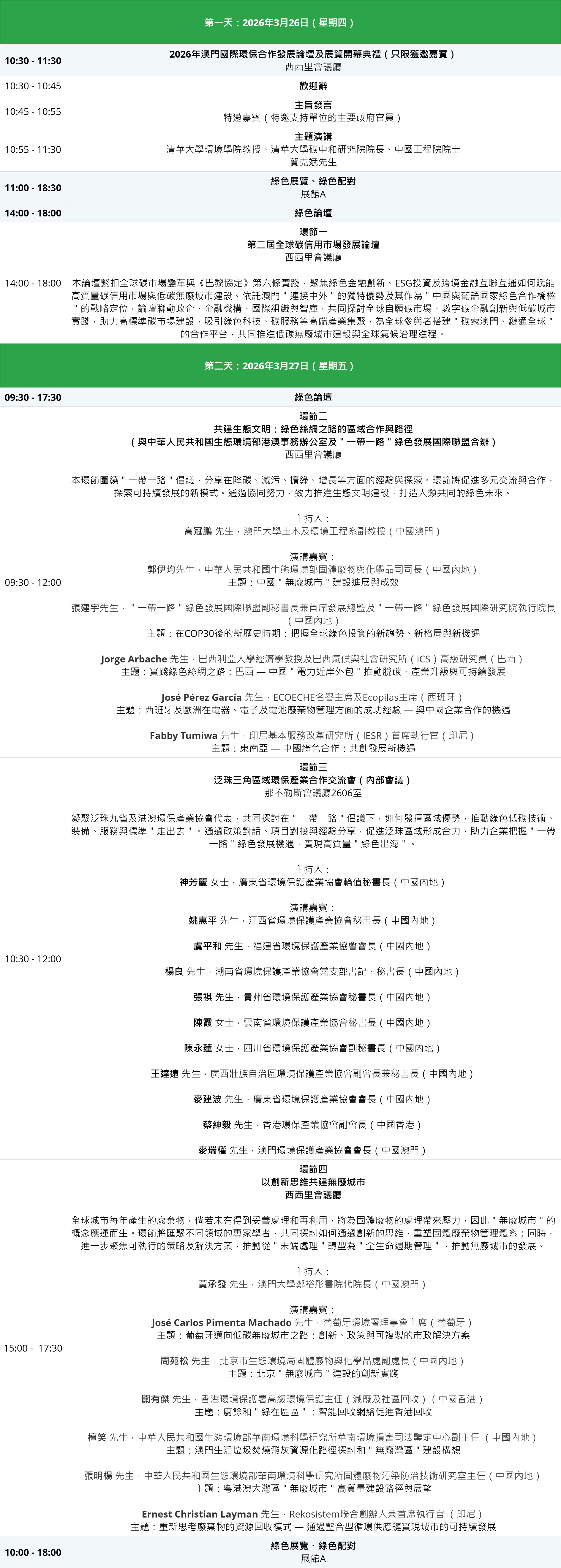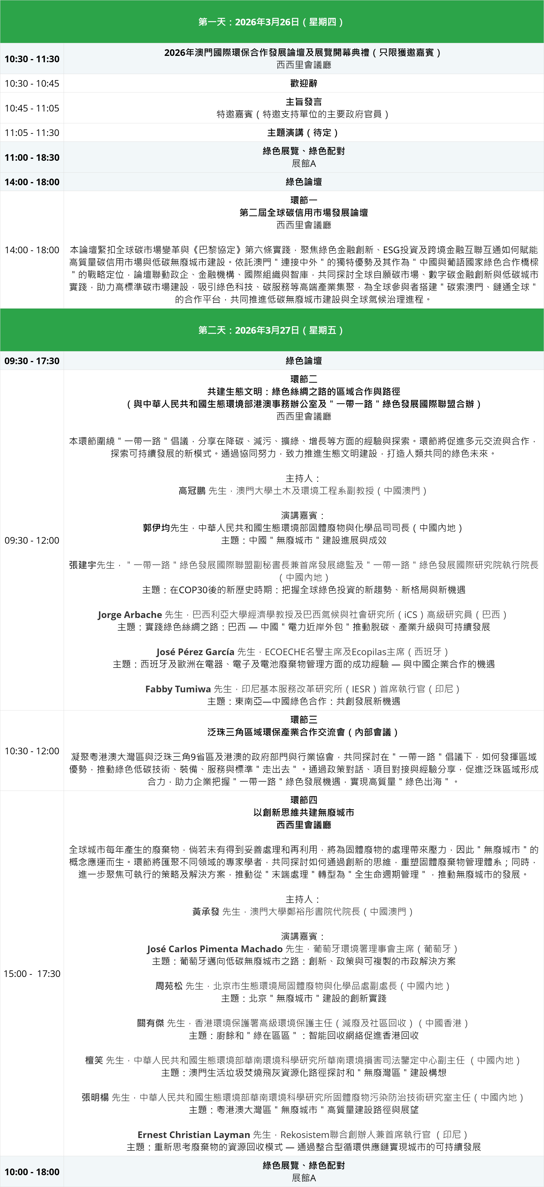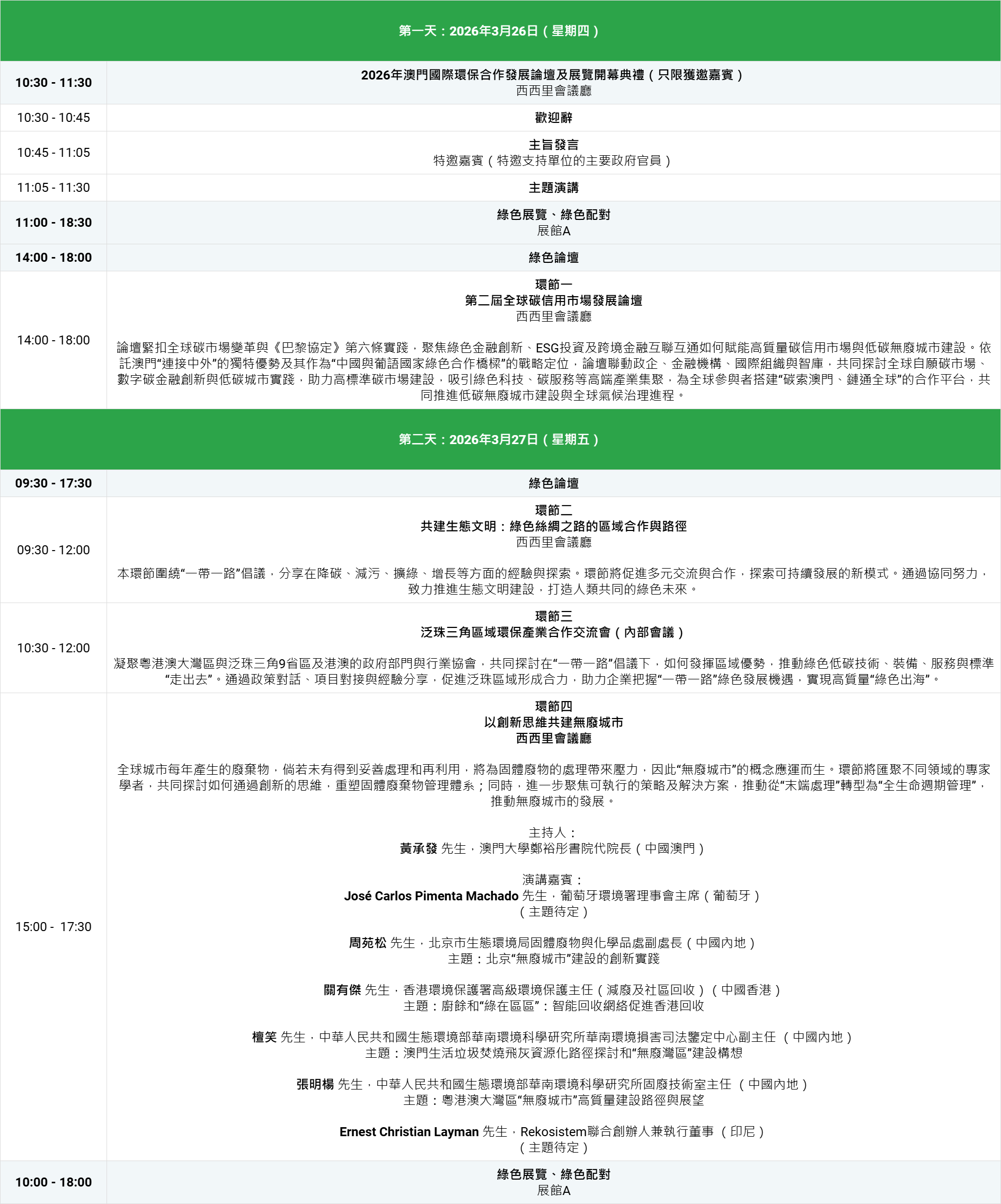 | 10:30 - 11:30 | 2026年澳門國際環保合作發展論壇及展覽開幕典禮(只限獲邀嘉賓) 西西里會議廳 |