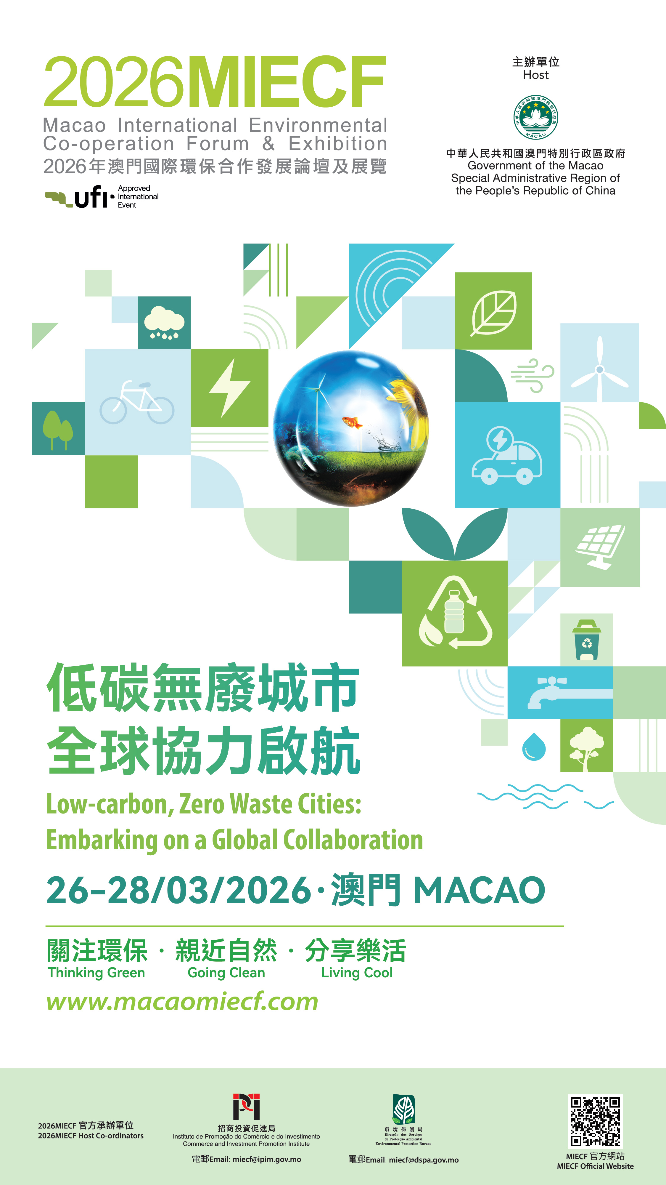 Organizado pelo Governo da Região Administrativa Especial de Macau (RAEM), o Fórum e Exposição Internacional de Cooperação Ambiental de Macau 2026 (doravante designado por “2026MIECF”) decorre de 26 a 28 de Março, na Cotai Expo, The Venetian Macao. O evento está alinhado com a estratégia de desenvolvimento da diversificação adequada da economia “1+4” do Governo da RAEM e com o posicionamento de coordenação regional “Macau + Hengqin”. Subordinado ao tema “Cidades de Baixo Carbono e com Zero Resíduos: Embarcando numa Colaboração Global”, o evento visa promover a construção de cidades de baixo carbono e sem resíduos, estimular o intercâmbio de tecnologias verdes e explorar oportunidades de negócio no mercado, contribuindo assim para posicionar Macau como um patamar regional de desenvolvimento sustentável e de oportunidades verdes de negócio. Isto será conseguido através da realização do Fórum Verde, em conjugação com a actualização da Mostra Verde, bem como a expansão e a diversificação dos serviços amigos do ambiente disponibilizados no recinto.