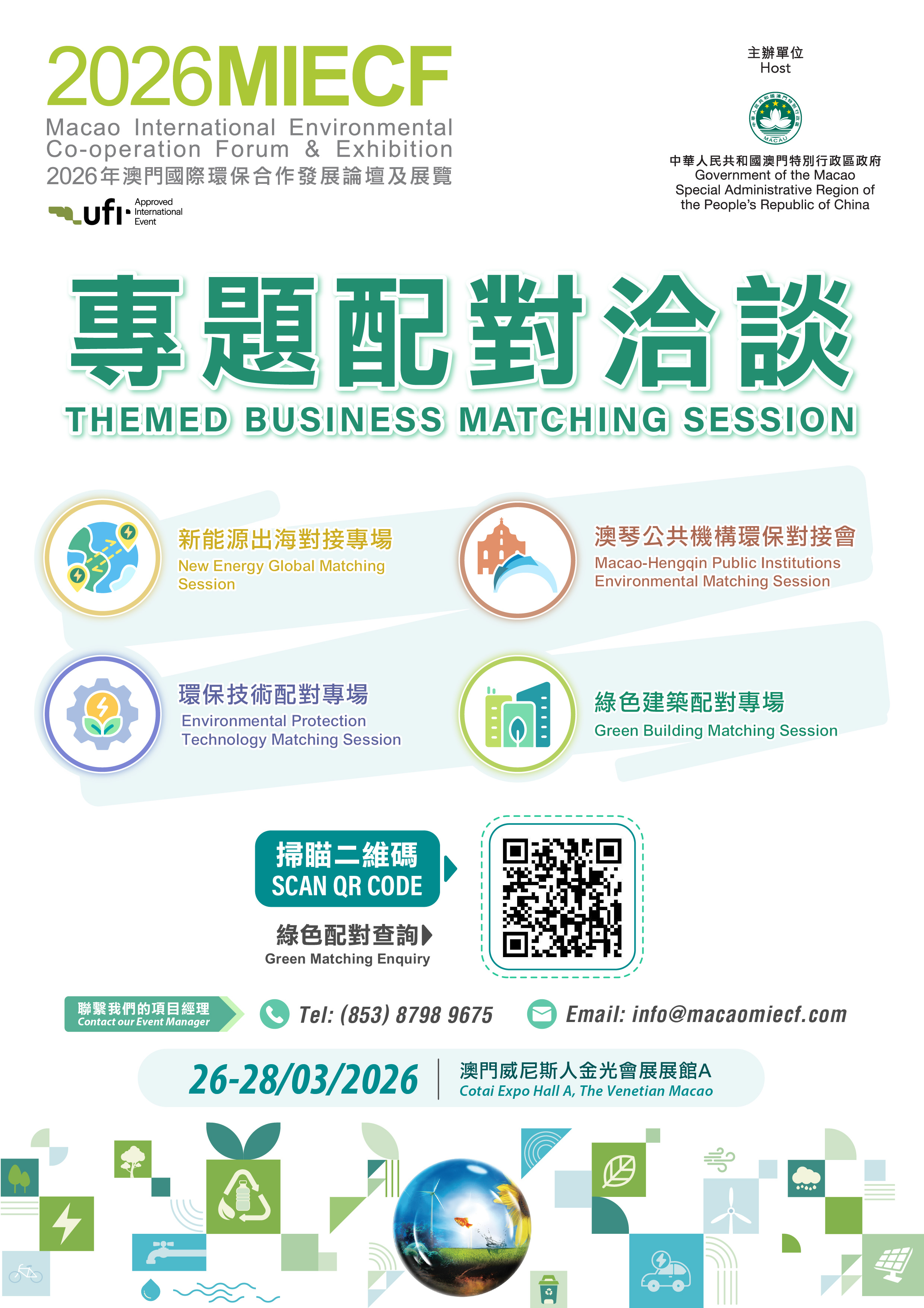 由澳門特別行政區政府主辦的2026MIECF將於3月26日至28日(周四至周六)假澳門威尼斯人金光會展舉行,為綠色創新科技及項目提供展示及合作平台。詳情請瀏覽大會網站(http://www.macaomiecf.com)或致電(853)8798 9675向主辦單位查詢;亦歡迎關注微信官方帳號"MIECF"以獲取最新大會資訊。