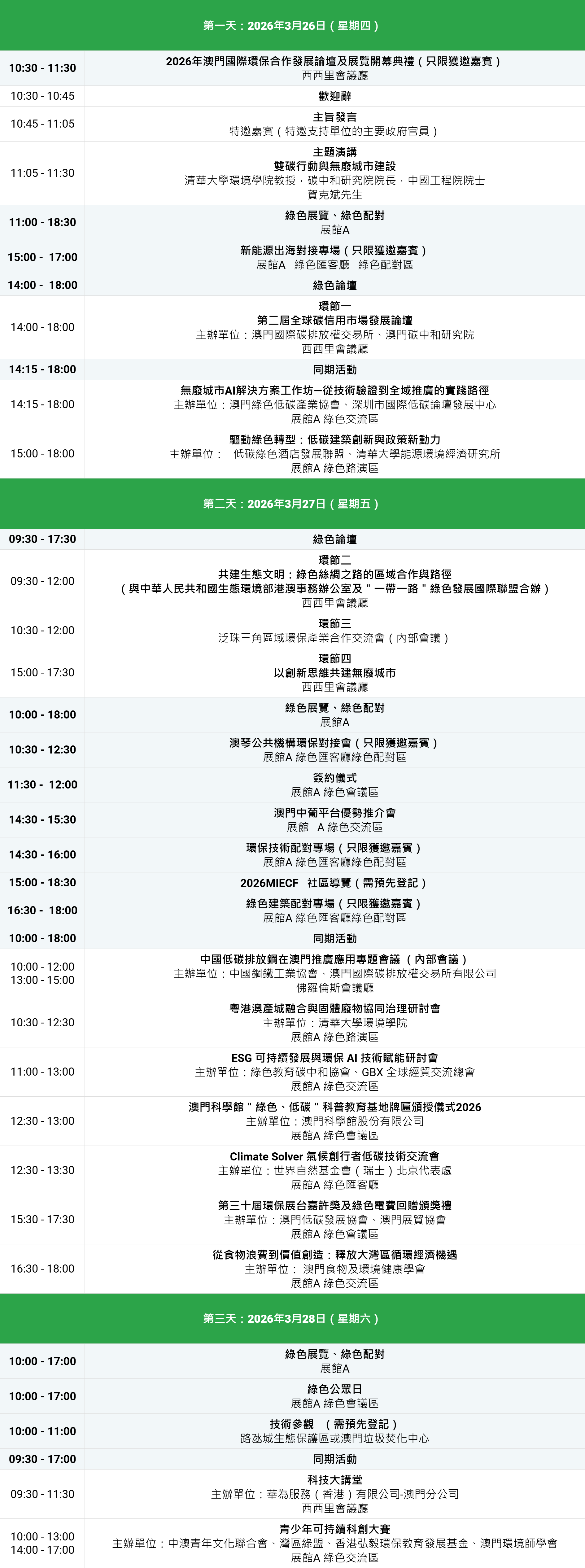 | 10:30 - 12:30 | 澳琴公共機構環保對接會(只限獲邀嘉賓) 展館A 綠色匯客廳綠色配對區 |