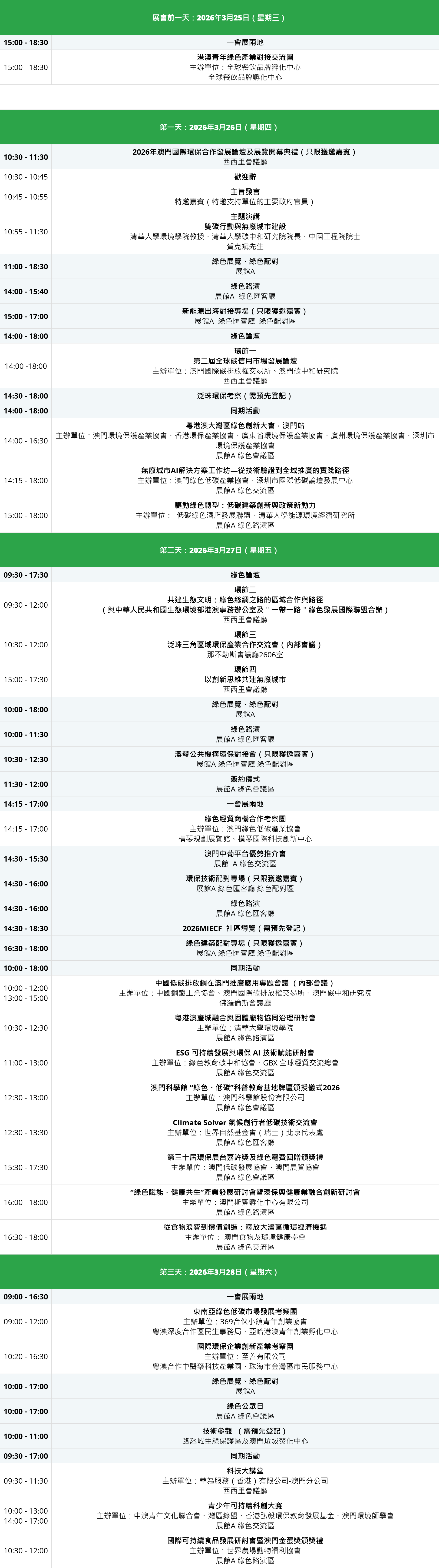 | 10:30 - 12:30 | 澳琴公共機構環保對接會(只限獲邀嘉賓) 展館A 綠色匯客廳 綠色配對區 |